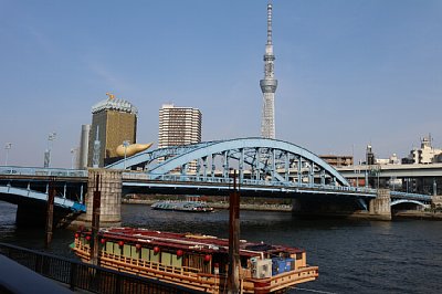 駒形橋は綺麗なアーチをもつ橋ですね、屋形船、スカイツリー、アサヒビール