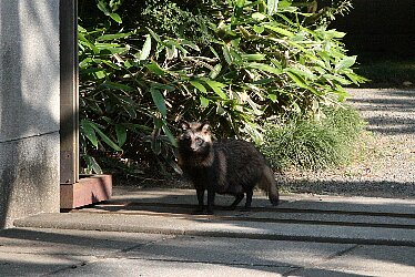 左は神田川、せまい川ですがすがすがしさがあります。途中の芭蕉園の入り口に突然あらわれた狸、都会にもいるのですね。