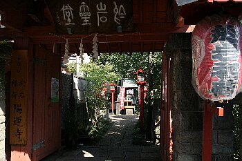 勝興寺から外苑東通り方向へと歩き東通りの手前を右にいくと、そのさき右側に於岩霊堂がある陽運寺(写真左)があり、
