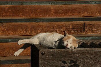 右の猫は大師堂の賽銭箱の上で昼寝中。